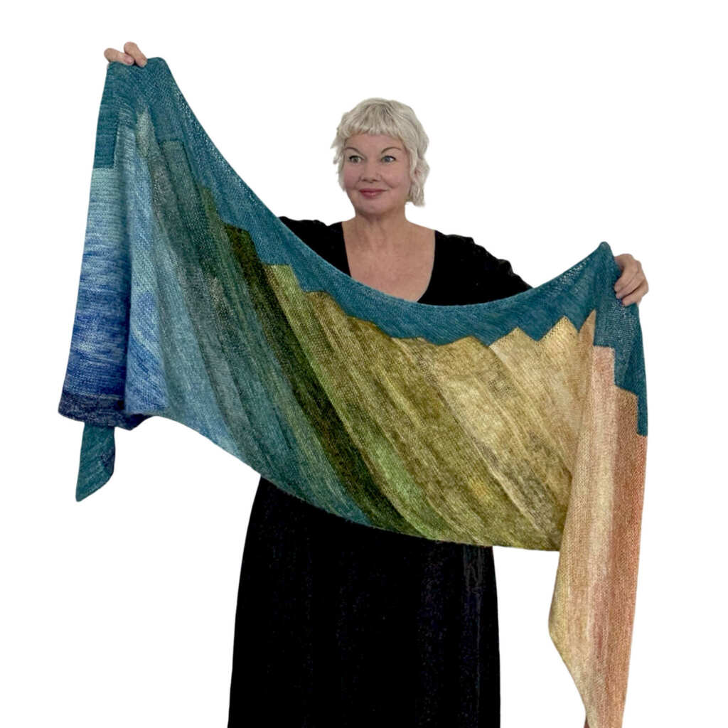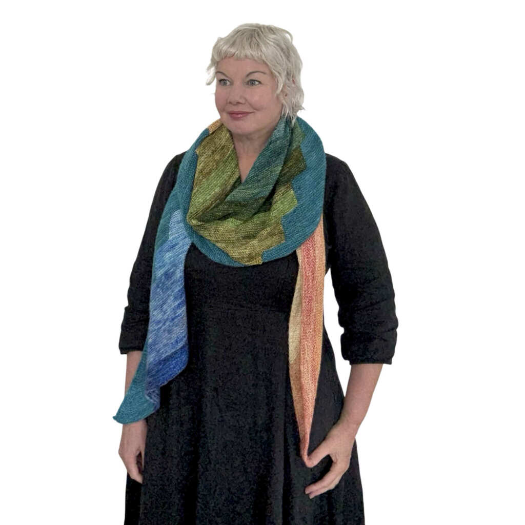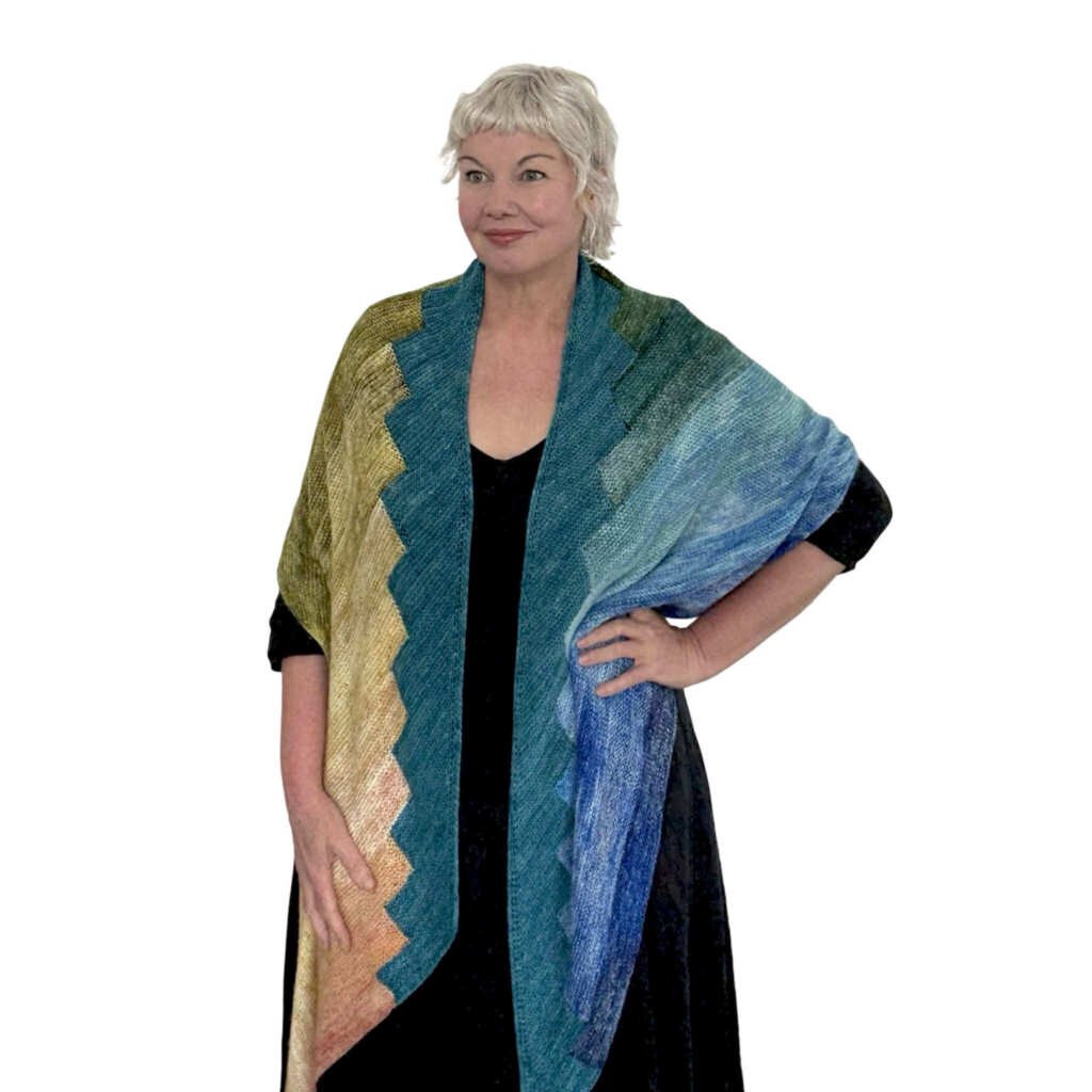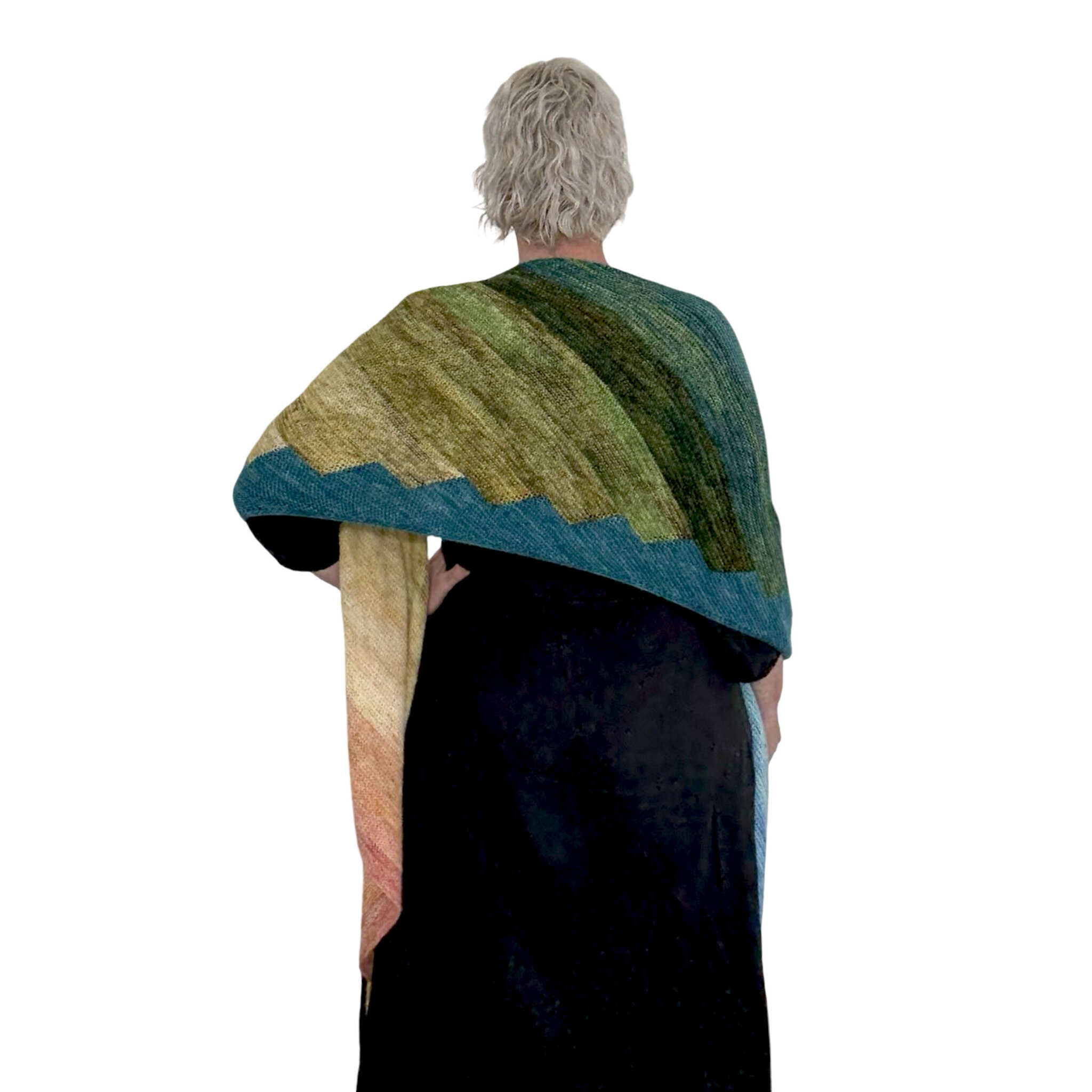 Make the most of a gorgeous 24-colour festive yarn set with this large wrap project. Cruisy garter stitch with a simple intarsia pattern is perfect for a first intarsia project and keeps things interesting. The Magiclands Wrap is a soothing project to retreat to during busy days and results in a large wrap to cosy up in. The simple pattern allows your gorgeous yarn to be the star of the show and includes a choice of DK or fingering weight yarn. Magiclands is a surf beach a short walk from my home. I wanted to honour the two yarn sets I chose for my projects, each ocean-themed, celebrating two coastal locations for different hemispheres. Magiclands is where I take my Aurora Australis images, also apt as Magiclands Wrap is the wrap version of the Aurora Hunter’s Shawl.
